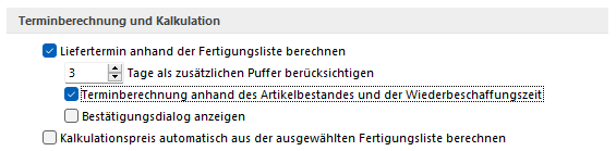 Terminberechnung anhand der Artikelverfügbarkeit - Zusätzlich zur Terminberechnung anhand der Durchlaufzeiten besteht die Option, neben den Durchlaufzeiten auch die Beschaffungszeiten der Verbrauchsartikel in die Terminberechnung einfliessen zu lassen. Hierzu können Sie durch Eingabe in den Mandanteneinstellungen des Fertigungsauftrag die Option Terminberechnung anhand der Artikelverfügbarkeit und der Wiederbeschaffungszeit nutzen.