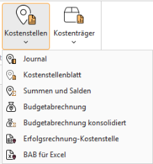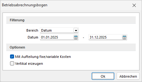 Die Auswertung ist nach Datum oder Periode möglich. Optional kann eingestellt werden, ob die Kosten nach fix und variabel separiert werden sollen oder ob eine Zusammenfassung dieser Kosten je Kostenstelle erfolgt.