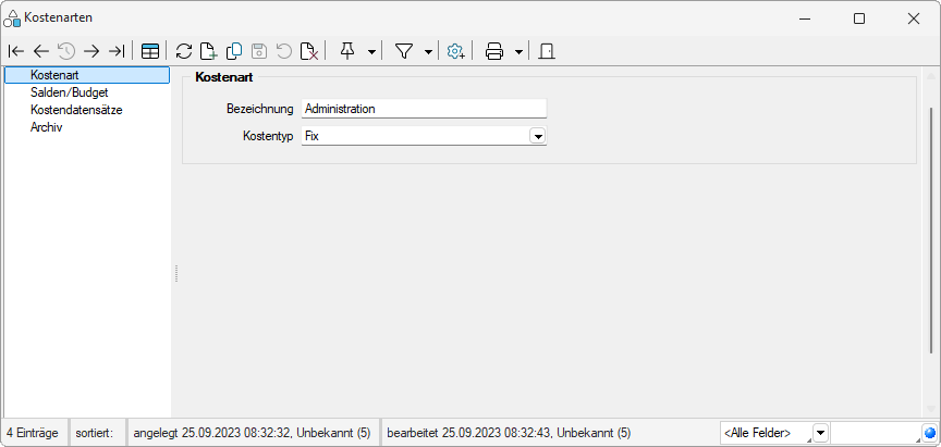 Die Angaben zur Kostenart werden auf mehreren Seiten erfasst bzw. dargestellt. Der Wechsel zu den jeweiligen Seiten wird über eine Baumstruktur im linken Maskenbereich gesteuert.