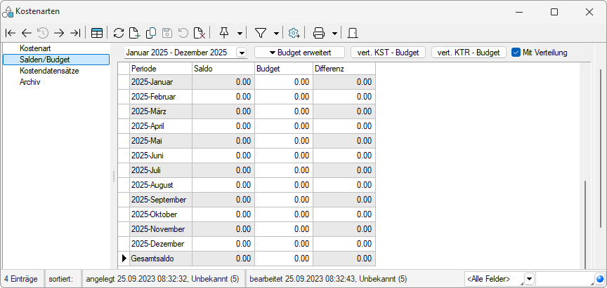 Auf der Seite Salden / Budget erhalten Sie einen Überblick über die monatlichen Salden der gewählten Kostenart.