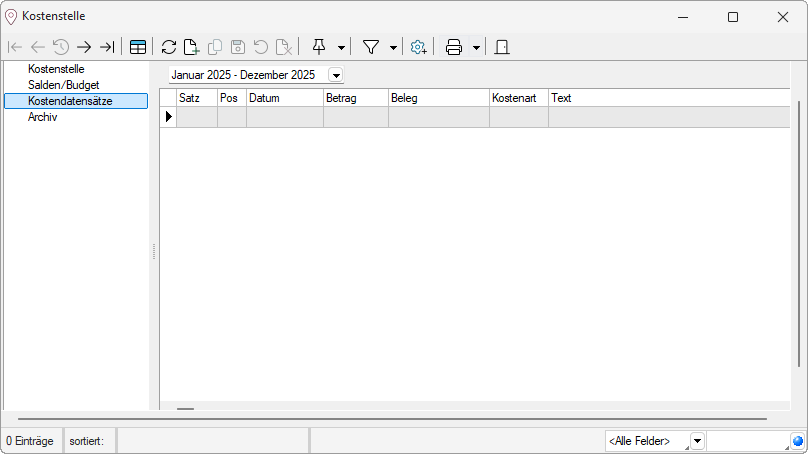 Auf der Seite Kostendatensätze sind alle Kosten, welche auf die gewählte Kostenstelle bzw. -träger gelaufen sind, getrennt nach Buchungszeiträumen aufgelistet.