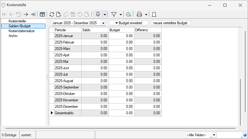 Auf der Seite Salden / Budget erhalten Sie einen Überblick über die monatlichen Salden der gewählten Kostenstelle bzw. Kostenträgers.