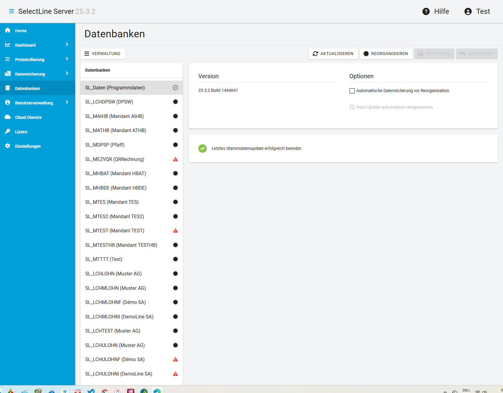 Über das Status Icon rechts sehen Sie, ob die Datenbanken reorganisiert sind oder ob eine Reorganisation nötig ist. Ist dies der Fall, markieren Sie diese Datenbank und führen Sie über die Aktionsleiste „Reorganisieren“ manuell aus. Während der Reorganisation werden alle Tabellenstrukturen mit ihren Vorgaben (Stand nach der Installation oder dem letzten Update) abgeglichen. Die Tabellen werden gepackt und alle Indexdateien neu aufgebaut. Bei der Reorganisation darf kein anderer Benutzer mit den zu reorganisierenden Daten arbeiten. Umgekehrt kann kein anderer Benutzer dieselben Daten nutzen, falls Sie vor ihm mit der Reorganisation begonnen haben.