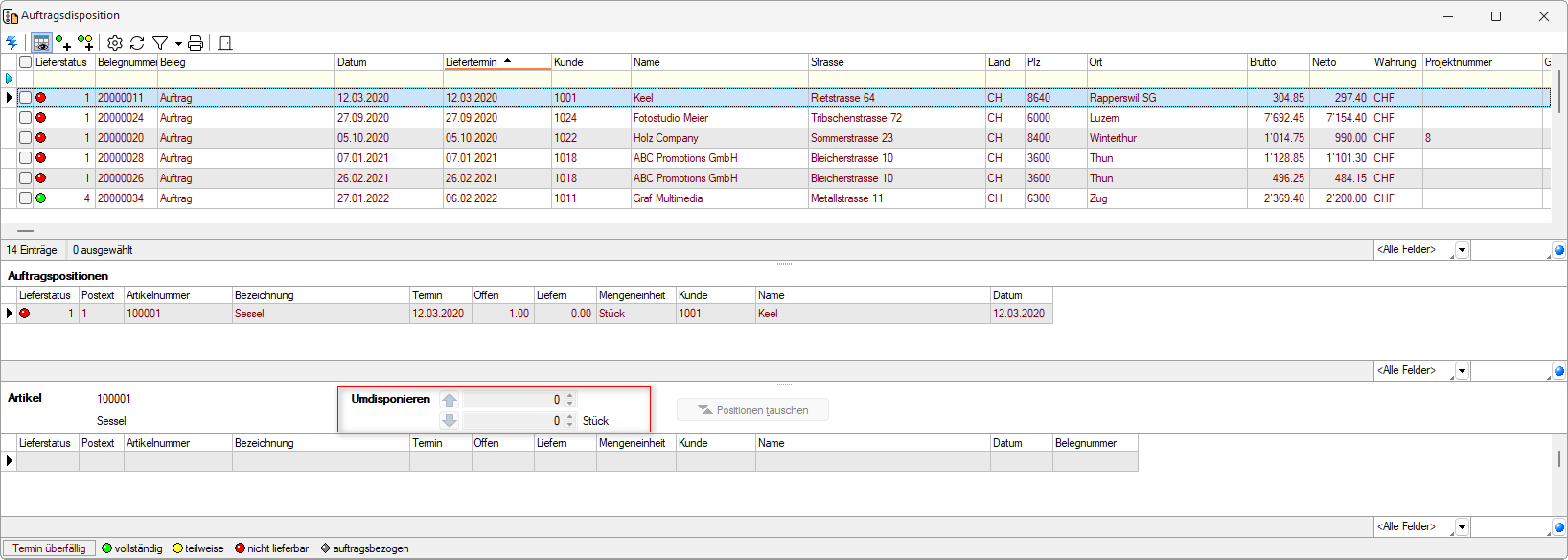 Möchte man diese Zuordnung ändern, kann man den vorhandenen Bestand eines Artikels umdisponieren, also einer Position, die noch nicht vollständig lieferbar ist, Bestände aus anderen Positionen zuordnen. Dazu wählt man zuvor in der mittleren oder unteren Tabelle die Position, der man mehr Bestand zuordnen möchte aus und kann über die Pfeile im Bereich Umdisponieren die Mengen verändern.