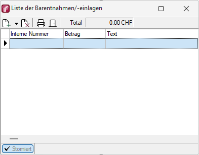 Die Liste enthält alle Bareinlagen und -entnahmen seit dem letzten Kassenabschluss.