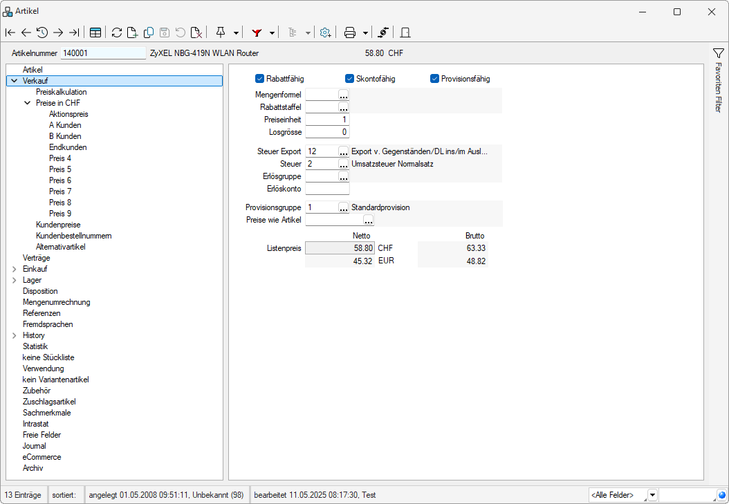 Alle Preise einschliesslich der Kalkulation werden vom ausgewählten Artikel, auch bei manueller bzw. automatischer Änderung, übernommen.