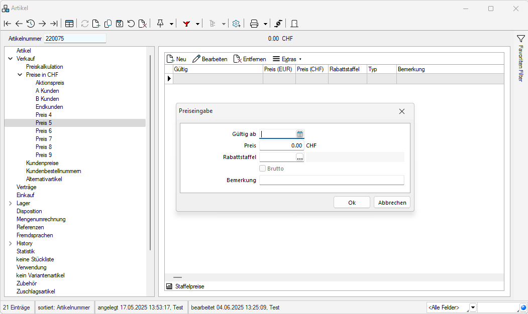 In dieser Eingabemaske legen Sie die Preise, deren Gültigkeitszeiträume