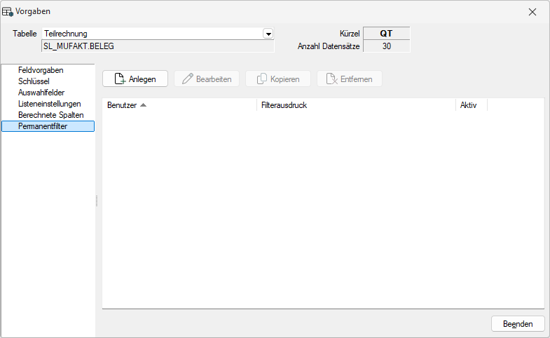 Über diese Filtermöglichkeit können Einschränkungen für die wichtigsten Daten im Auftrag angelegt werden, die z.B. eine Anzeige der Daten abhängig vom aktuellen Benutzer ermöglichen. So kann über folgendes Beispiel verhindert werden, dass der Benutzer „mb“ Kunden sieht, bei denen er nicht als Vertreter eingetragen ist. Die Konfiguration des Permanentsfilters erfolgt über die Vorgabewerte. Bei Tabellen bei denen die Möglichkeit nicht zur Verfügung steht, wird der Baumeintrag Permanentfilter ausgegraut.