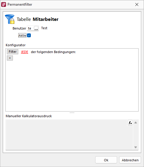 Die Einstellungen werden benutzerbezogen erstellt, können aber für andere Benutzer abgeleitet werden. Über das Deaktivieren der Option Aktiv kann die Filterung abgeschaltet werden, ohne die bereits eingegebenen Einschränkungen oder Kalkulatorausdrucke zu verlieren (z.B. für Tests). Im Bereich Konfigurator können schnell und einfach beliebige Filterkriterien zusammengestellt werden.