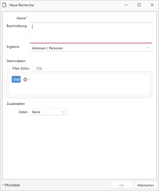 Das Anlegen, Bearbeiten und mehrfache Ausführen von Recherchen ist in der Liste der Adressen und Personen möglich.