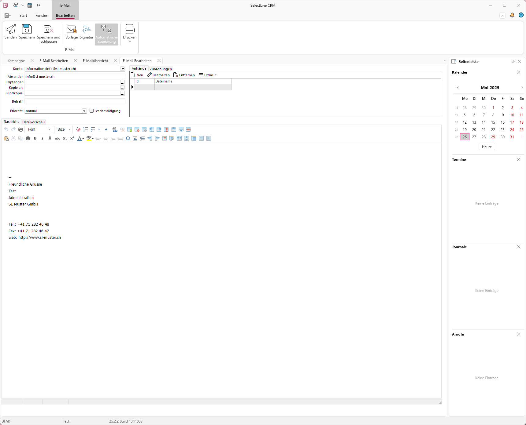 In der Erfassungsmaske kann die "E-Mail" mit Absender, Empfänger und Signatur vorbelegt werden.