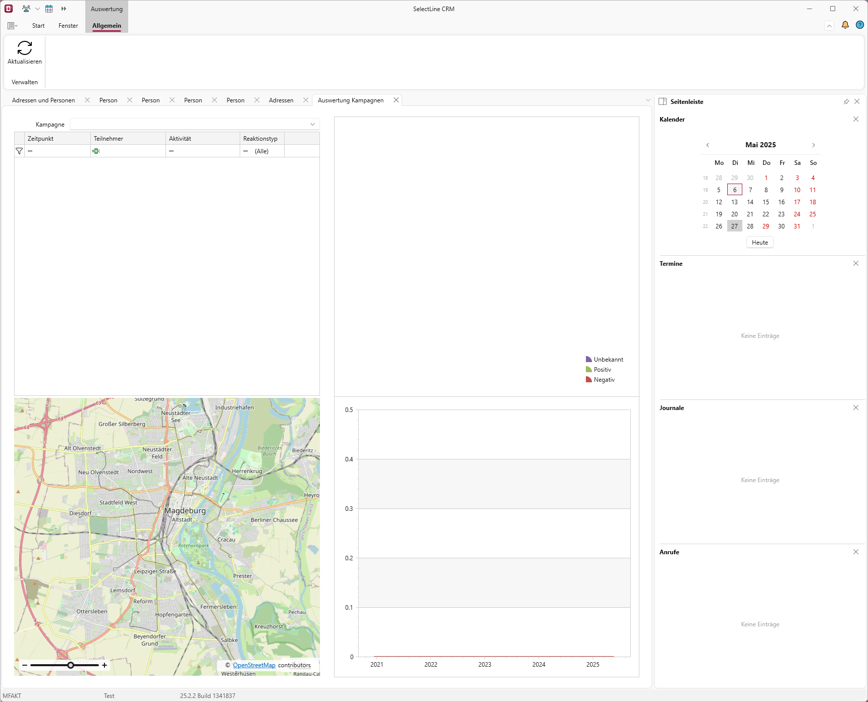 Über den Menüpunkt Start / Marketing / Kampagnen / Auswertung oder aus der Liste der Kampagnen wird die Auswertung geöffnet. Die linke Tabelle zeigt alle protokollierten Änderungen an. In einem Tortendiagramm ist schnell ersichtlich, wie viele positive, negative und neutrale Reaktionen es zu der "Kampagne" gab. Der Verlauf der Änderungen der Kampagne ist in einem Liniendiagramm dargestellt. Alle Teilnehmer der Kampagne werden auf einer Karte angezeigt und können von hier auch geöffnet werden.