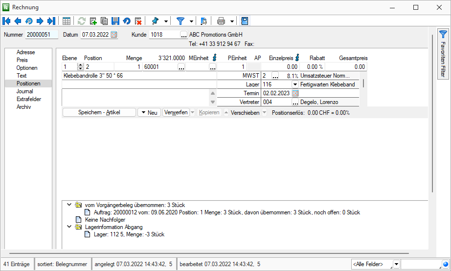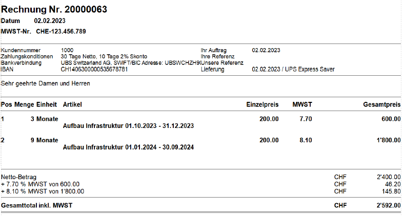 Um eine Rechnung zu erstellen, die sowohl Leistungen im Jahr 2023 als auch 2024 umfassen, müssen Sie die Positionen zeitlich abgrenzen. Im folgenden Beispiel wird eine Dienstleistung erfasst, die vom 01.10.2023 bis 30.09.2024 geleistet wird. Im Beleg ist eine Position bis Ende 2023 mit dem herkömmlichen Steuerschlüssel zu erstellen. Für die Periode vom 01.01.2024 bis 30.09.2024 muss eine zweite Position erfasst und mit dem Übergangsteuerschlüssel versehen werden. Somit erhält diese Position die Mehrwertsteuer für das Jahr 2024, da die Leistung im Jahr 2024 erfolgt.