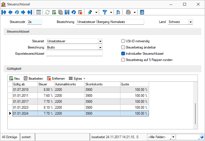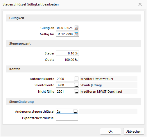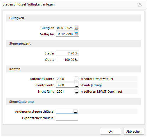 Somit wird für Belege mit einem Datum ab 01.01.2024 der neue Steuersatz angewendet.