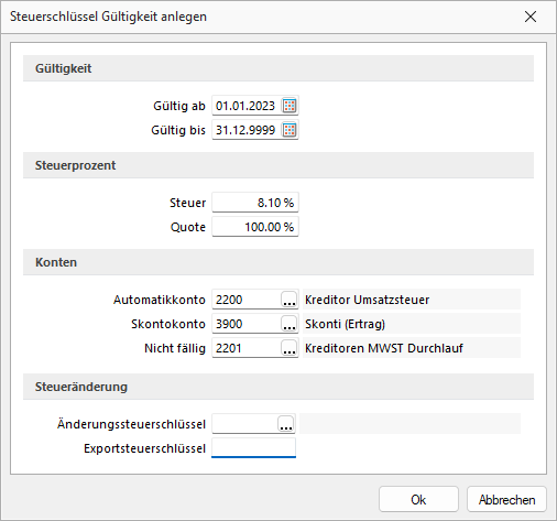 Alle weiteren Angaben (wie Konten oder Pauschaltsteuerschlüssel) übernehmen Sie aus den bereits bestehenden Gültigkeitsbereichen.