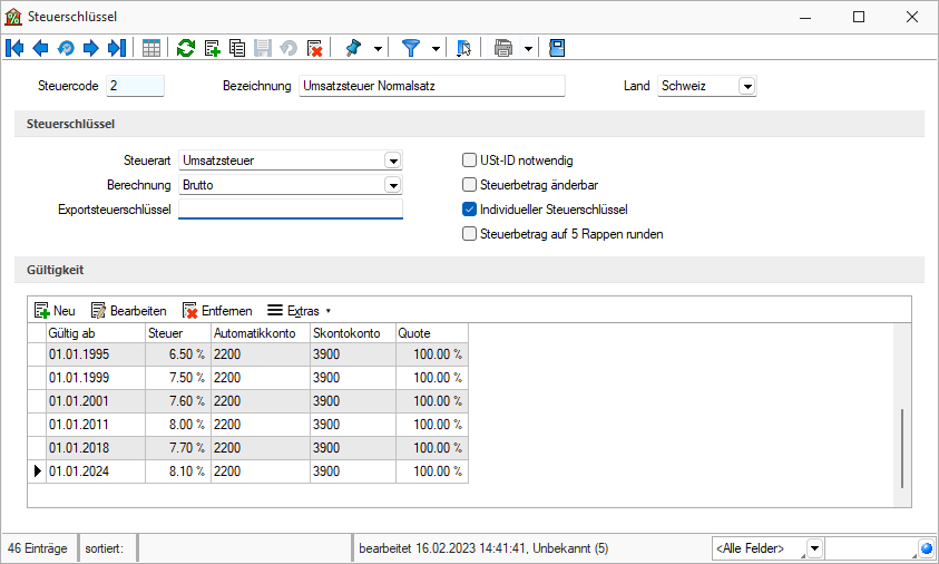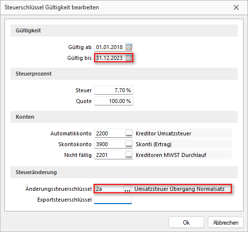 Passen Sie alle Ihre Steuerschlüssel, welche derzeit die Steuerprozente 7.7%, 3.7% oder 2.5% aufweisen, gemäss obiger Beschreibung an.