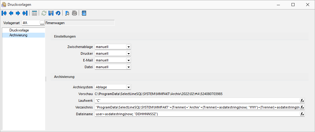 Hinweis: Nehmen Sie die Einstellungen für die "Archivierung" nicht an Systemdruckvorlagen vor! Diese werden bei einem Update überschrieben.