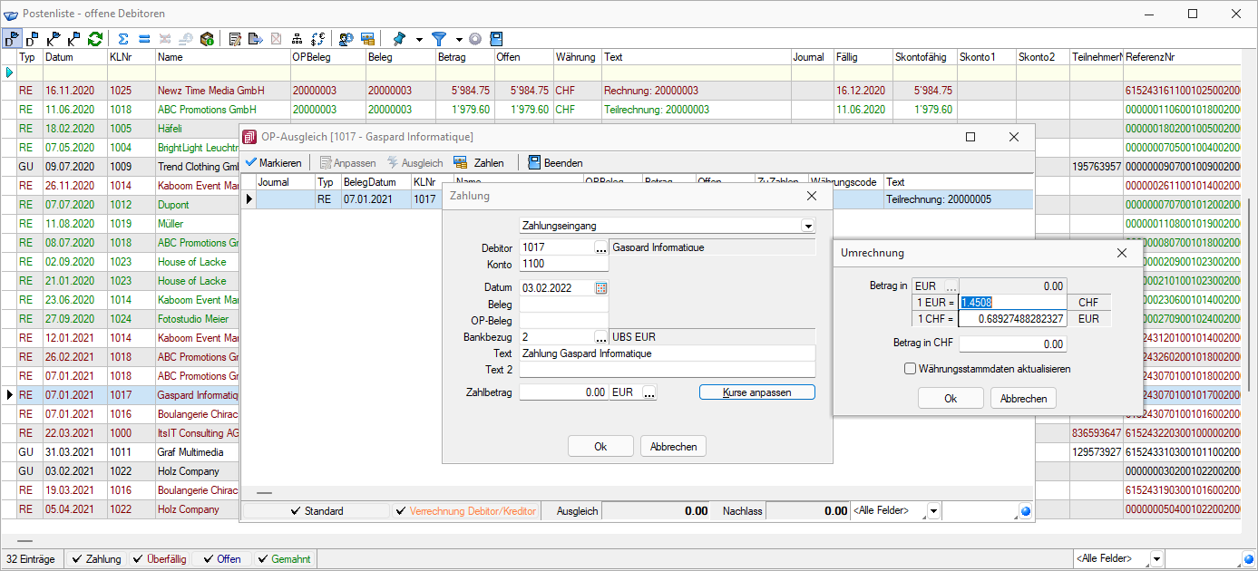Fremdwährungskurs (nur, wenn Fremdwährungskurs vorgegeben ist) - Aus dem hinterlegten Kurs (standardmässig wird der Tageskurs vorgeschlagen) wird der Betrag in der Mandantenwährung ermittelt.