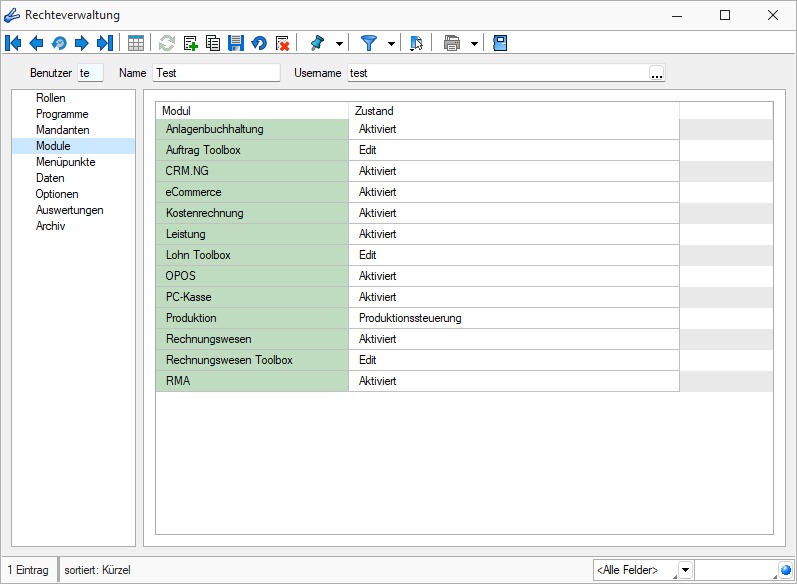 Unter Applikationsmenü / Rechteverwaltung / Module können Sie den Zugriff für weitere Programmfunktionen einschränken.