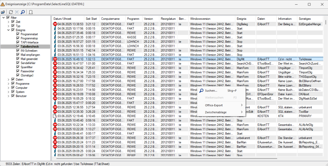 Mit diesem Dialog unter Hilfe / Programm / Ereignisanzeige - [Ctrl] + [F] können Sie eine Volltextsuche vornehmen.