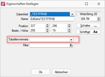 Um ein Extrafeld vom Typ Tabellenverweis mit einer entsprechenden Filterung auszustatten, muss der Änderungsmodusfür Extrafelderaktiviert werden. Anschliessend können die Eigenschaften des gewünschten Feldes bearbeiten werden, indem es selektiert und anschliessend im Kontextmenü Bearbeiten gewählt wird. Hier können Sie über die bekannte Vorgehensweise für das Extrafeld eine Schalterfunktion bestimmen. Ist diese vom Typ Tabellenverweis, existiert nun unter der Auswahl der Zieltabelle für den Tabellenverweis ein Formelfeld für die Definition des Filters.