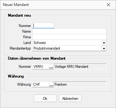 Übernehmen Sie die Daten für einen neuen Mandanten in der Schweiz aus einem der Vorlagemandanten VKMU, VKMUF oder VKMUI.