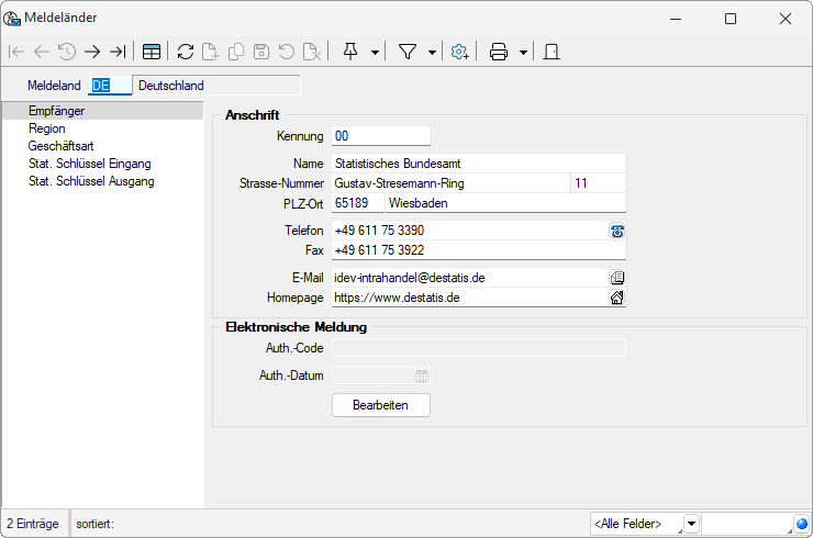 Unabhängig vom eigenen Mandantenland stehen die Stammdaten der Meldeländer Deutschland und Österreich unter Stammdaten / Intrastat / Meldeländer zur Verfügung. Sie werden vom Programm bereitgestellt und können nicht geändert werden.