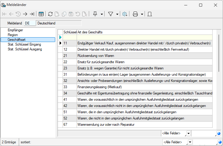 Die im Meldeland üblichen Geschäftsarten werden mitgeliefert. Auch sie können in den Länderbezogenen statistischen Artikelangaben und in den Meldungen ausgewählt werden.
