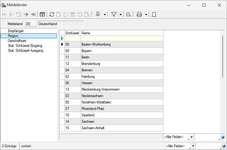 Für das Meldeland Deutschland werden die Regionen (Bundesländer) mitgeliefert. Sie können in den Länderbezogenen statistischen Artikelangaben und in den Meldungen als Ursprungsregion verwendet werden.