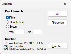 Wurde als Druckausgabeziel der Drucker gewählt bzw. der Druck aus der Druckvorschau aufgerufen, können Sie in dieser Maske wahlweise den Druckbereich festlegen für: