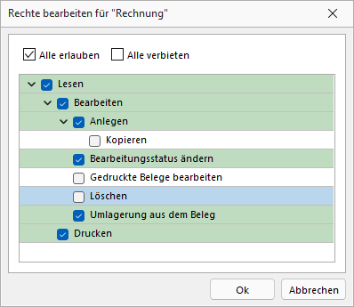Hinweis: Werden Rechte geerbt, müssen bei abhängigen Datenrechten (z.B. Löschen, Anlegen oder Kopieren von Lesen) erst die übergeordneten Rechte individuell erlaubt werden, anderenfalls kann ein abhängiges Recht nur erben oder verboten werden.