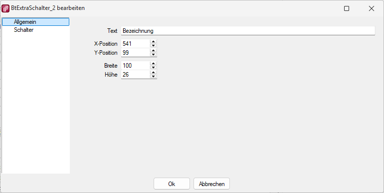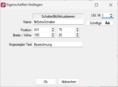 Legen Sie Position, Breite und Höhe des Schalters fest. Vergeben Sie eine Bezeichnung für den Schalter, diese ergibt die Schalterbeschriftung. Über die laufende Nummer wird die Ansprungreihenfolge innerhalb der Maske geregelt.