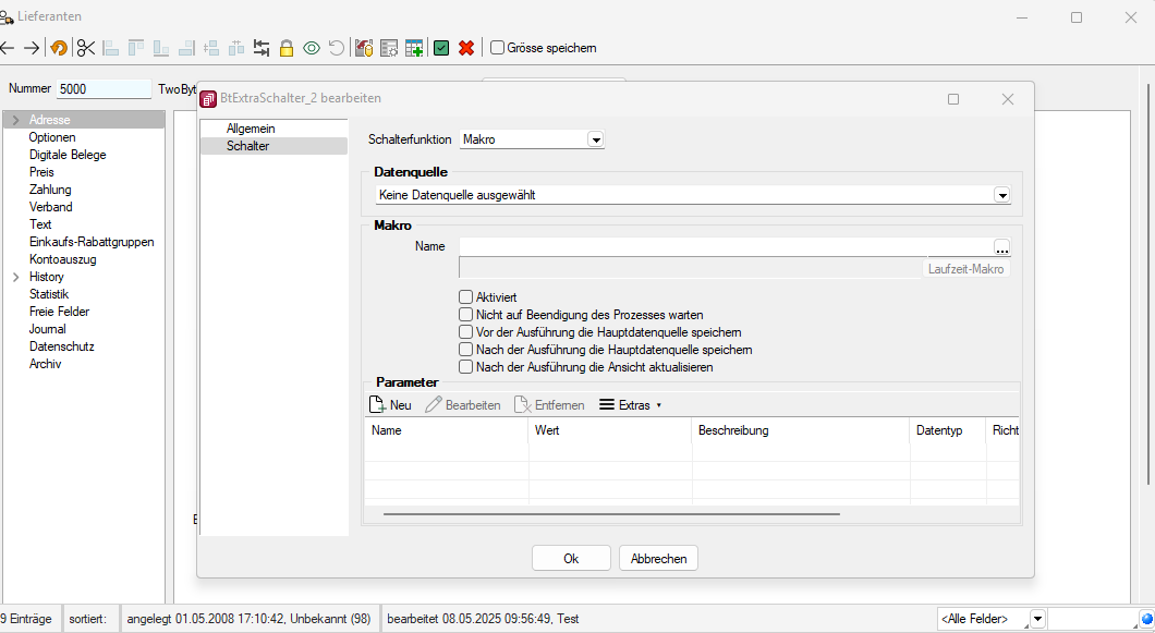können Sie das gewählte Makro bearbeiten und abändern. Mit dem Optionsfeld ”Aktiviert” wird die Ausführbarkeit des ausgewählten Makros über den Schalter freigegeben. Ausserdem können Sie optional einstellen, ob nach der Ausführung des Makros der Dialog aktualisiert werden soll, oder ob vor Ausführung der Anweisung noch mal gespeichert werden soll.