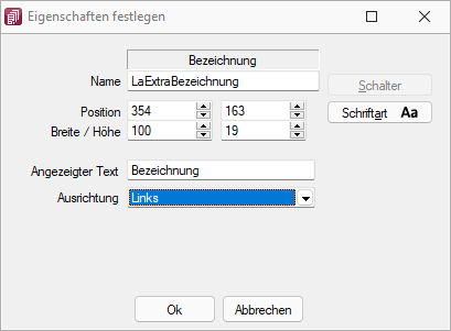 Jedem neuen Element müssen Sie die definierenden Eigenschaften, wie die Position in der Maske, die Ausrichtung, den angezeigten Text, die Schriftart, die Ansprungreihenfolge, ob Auswahl aus Tabelle, Liste oder Historie, zuweisen.