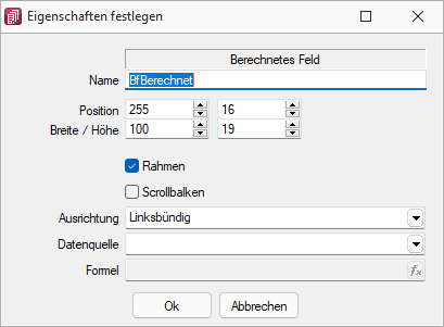 Rahmen / Scrollbalken (nur für berechnete Felder, Rahmen auch für Bildverweis): Rahmen und Scrollbalken können optional ein- oder ausgeblendet werden.