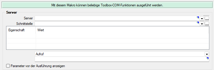 - im Makroassistent ein neues Toolbox-Makro vom Typ COM-Aufruf anlegen