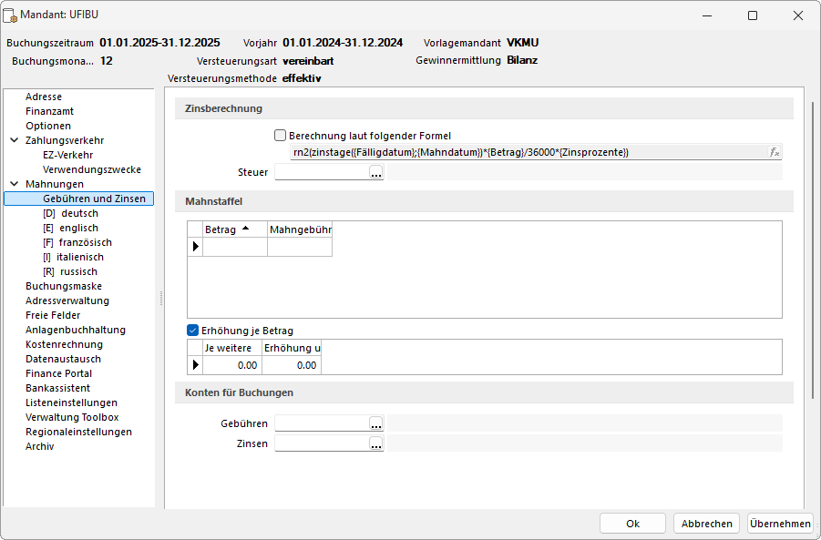 Die Mandanteneinstellungen wurden um den Bereich Gebühren und Zinsen erweitert. Hier können alle für die Verbuchung erforderlichen Konten hinterlegt werden. Diese Konten sind notwendig, um die Verbuchung durchzuführen.