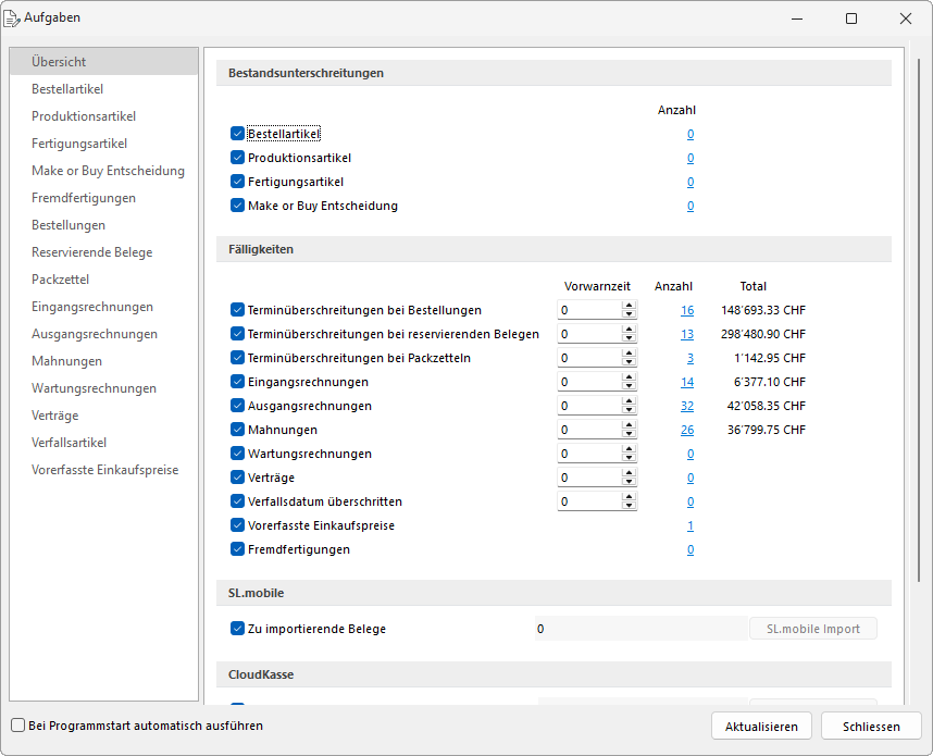 Um für die im SelectLine Auftrag anfallenden Tätigkeiten einen besseren Überblick zu haben, können diese beim Programmstart oder über den Menüpunkt Mandant / Überblick / Aufgaben in einer kompakten Übersicht angezeigt werden.