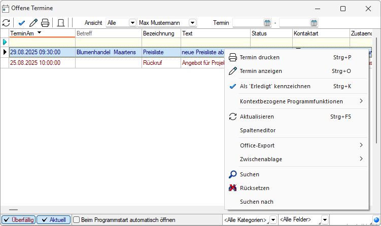 Der Dialog Offene Termine öffnet sich mit der zuletzt gewählten Ansicht (Aktuelle oder Alle).