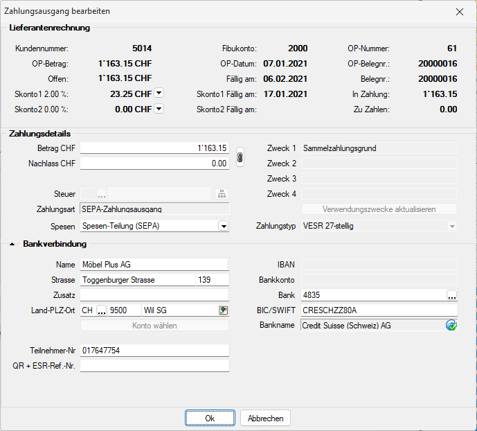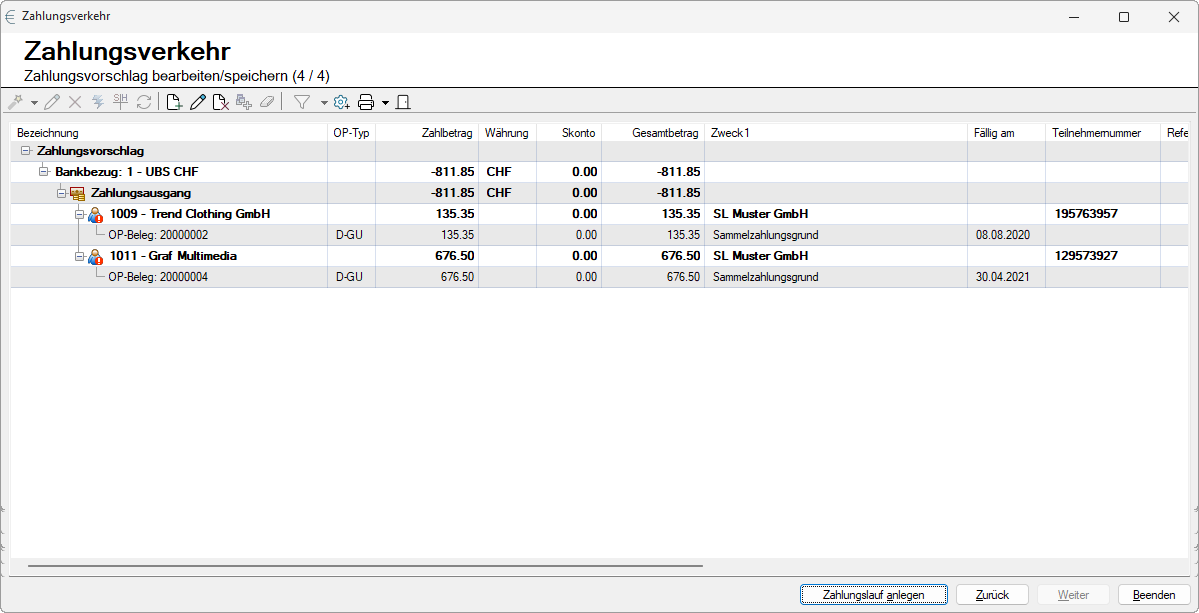 Zahldatum, Zahlungsart und Bankbezug ein separater Zahlungslauf erstellt.