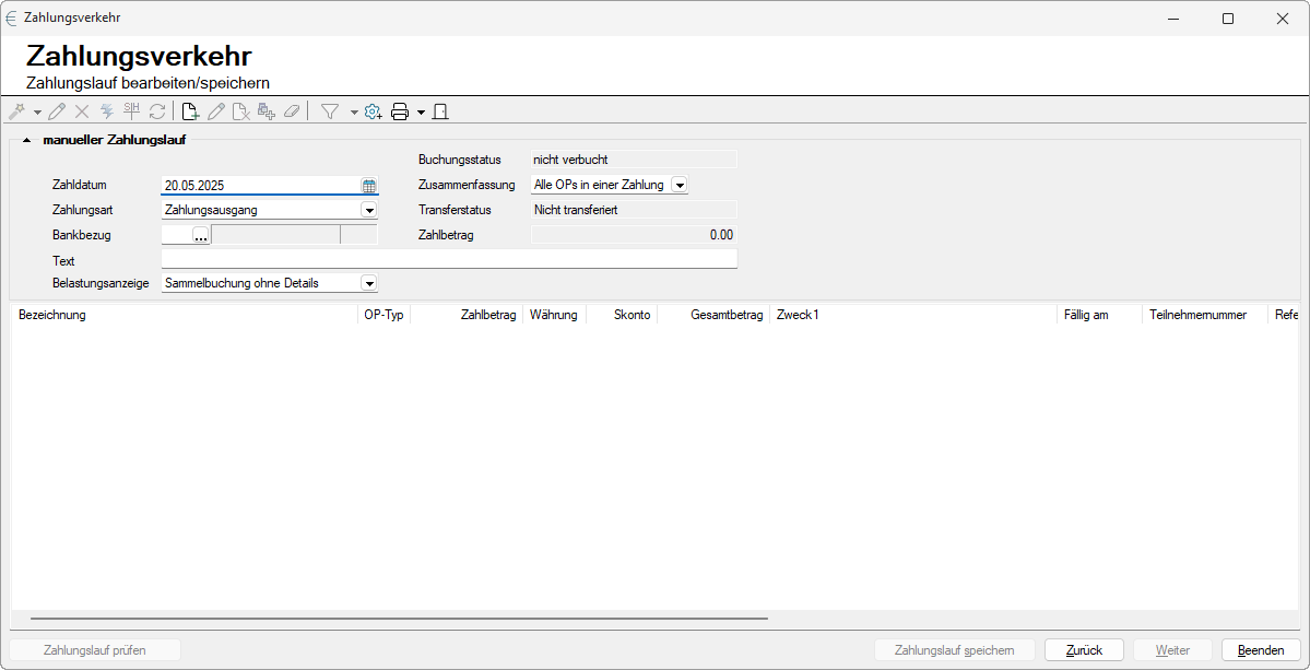 Im Unterschied zum Bearbeiten eines gespeicherten, bereits vorhandenen Zahlungslaufes ist jetzt, so lange noch keine Position enthalten ist, die Zahlungsart zur Auswahl frei. Ebenso die Zusammenfassung.