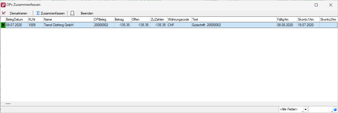 Markieren Sie den Offenen Posten, welcher Ihr Haupt-OP sein soll, und wählen Sie aus. In der Folgeliste werden ihnen alle Posten der gewählten KLNr angezeigt, die den o.g. Kriterien entsprechen. Ihr Haupt-OP ist der Posten, welcher nach der Zusammenfassung auf der offene Seite bestehen bleiben soll. Dieser wird grün markiert. Geändert werden kann diese Selektion über [Shift] + [Leer].