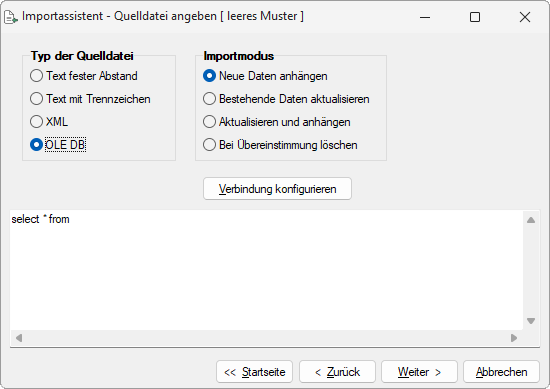 Tragen Sie unter Schnittstellen / Assistenten / Import (Quelltyp OLE DB) die Verbindungszeichenkette ein oder betätigen Sie den Schalter am Eingabefeld, um die Verbindung zur Importdatei zu konfigurieren.