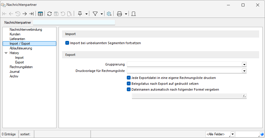 Die Liste kann nach Nachrichtenpartner und einzelnen Belegtypen selektiert werden. Mit Aktivierung der Option Testübertragung ist es möglich, einen Export zu simulieren.