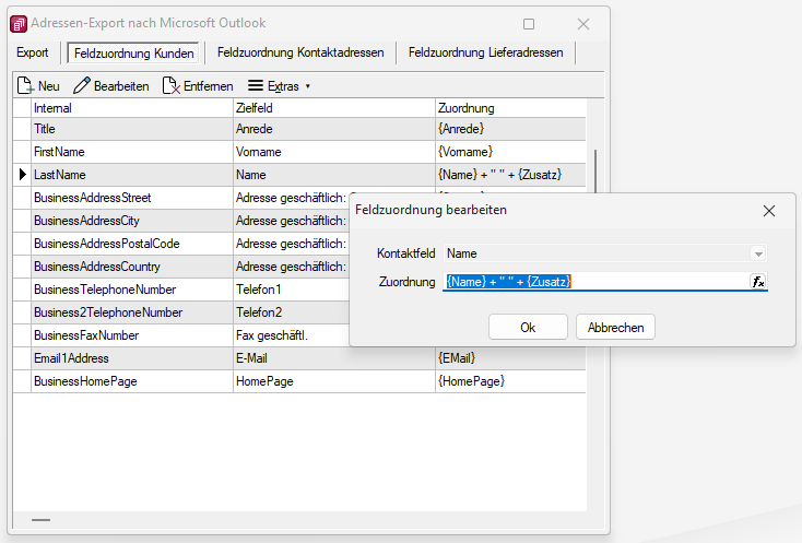 Über die Schalter bzw. beim Adress-Export gelangen Sie in den Dialog der Feldzuordnung.