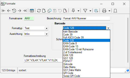 Unter Stammdaten / Konstanten / Weitere ... / Formate (Auswahlfeld Barcode) können Platzhalter, die eine Zeichenkette liefern, auch als Barcode (Strichcode) formatiert werden. Es werden folgende Typen unterstützt.