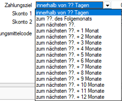 Zahlungsziel - Skonto - Als Zahlungsziel tragen Sie ein, binnen wie vieler Tage Rechnungen zu bezahlen sind. Ausserdem können Sie noch zwei Termine mit unterschiedlichen Skontosätzen festlegen. Die Fristen können als Abstand zum Rechnungsdatum (in Tagen) oder als konkretes Datum angegeben werden.