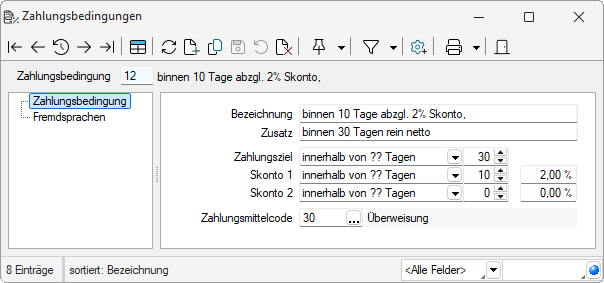 Bezeichnung - Zusatz - Zur Bezeichnung der Zahlungsbedingung stehen Ihnen 2 Felder mit 80 Zeichen zur Verfügung.