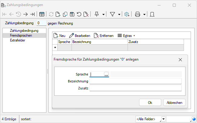 Auf der Seite Fremdsprachen können Sie Fremdsprachenbezeichnungen für Ihre Zahlungsbedingungen erfassen.