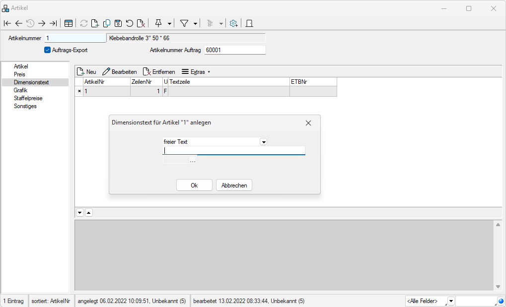 Hier unter Stammdaten / Allgemein / Artikel (Seite Dimensionstext) verwalten Sie auf einfache Weise die zum Artikel gehörenden